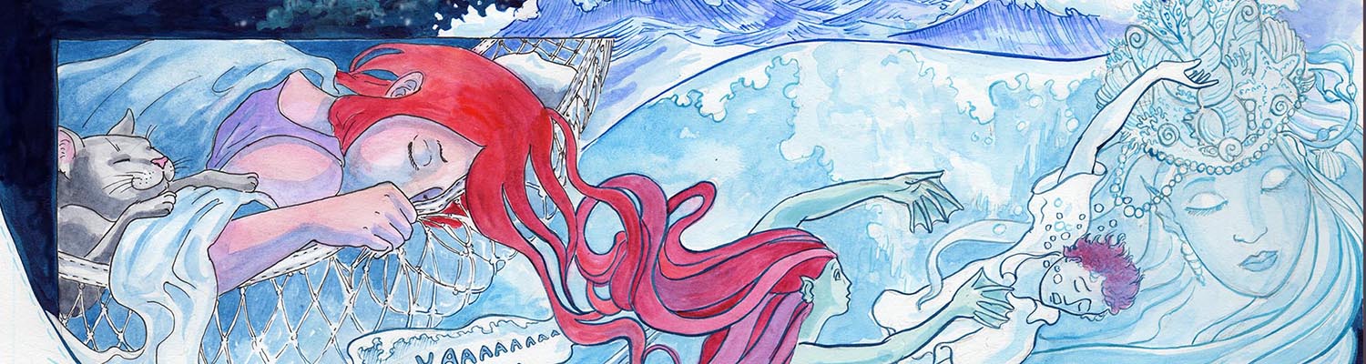 I also added a bit of Photoshop magic to tint the mermaid green. I’d already painted her scales (in watercolour) and I didn’t want to risk muddying them by painting a wash over them. I was originally going to leave her blue and white, like the rest of the dream, but a friend suggested it and I thought it was a good idea!
