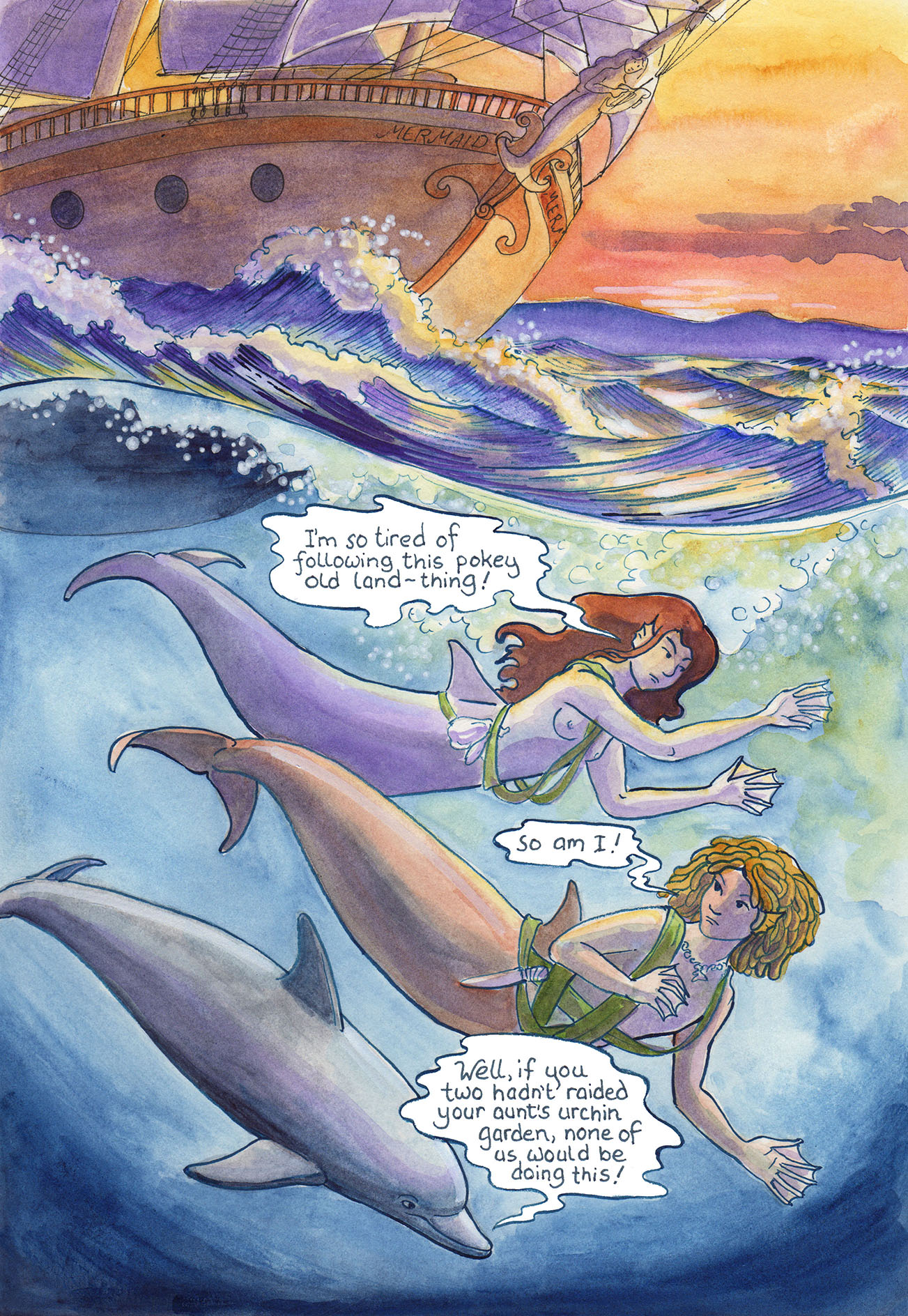 I’m really excited about this page— I’ve been itching to start drawing the mer-folk, but it wasn’t time yet — and now it is! And wouldn’t you know it, it’s a couple of teenage delinquents on remedial duty. Find out more about who they are and why they are following the ship in the next few pages.