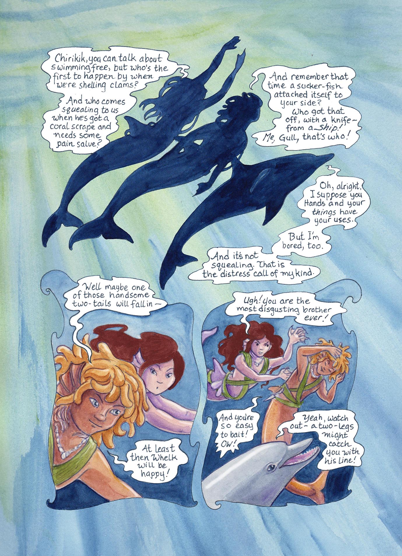 Page 53 — Introducing Whelk of the Octopus clan, Gull of the Anemone clan, and Chirikik of the Fins. Hands and Fins can do so many things for each other… in this case they can get each other in trouble!