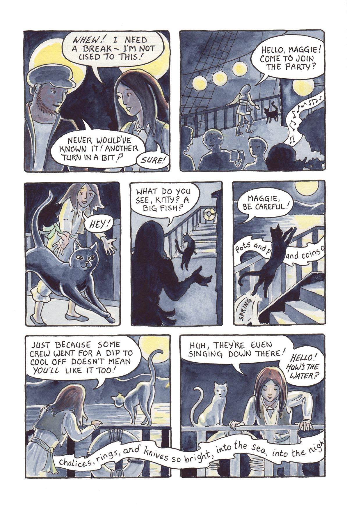 It’s good to be back aboard The Mermaid! I’ve been working on two book projects for publication over the last couple of months, and while one takes place at the seashore (and under the waves) it’s no substitute for my own beloved comic. I’ve really enjoyed drawing Maggie’s little excursion (if you follow my other work, you’ll know drawing cats is one of my favourite things), and she will certainly have more adventures in upcoming chapters.